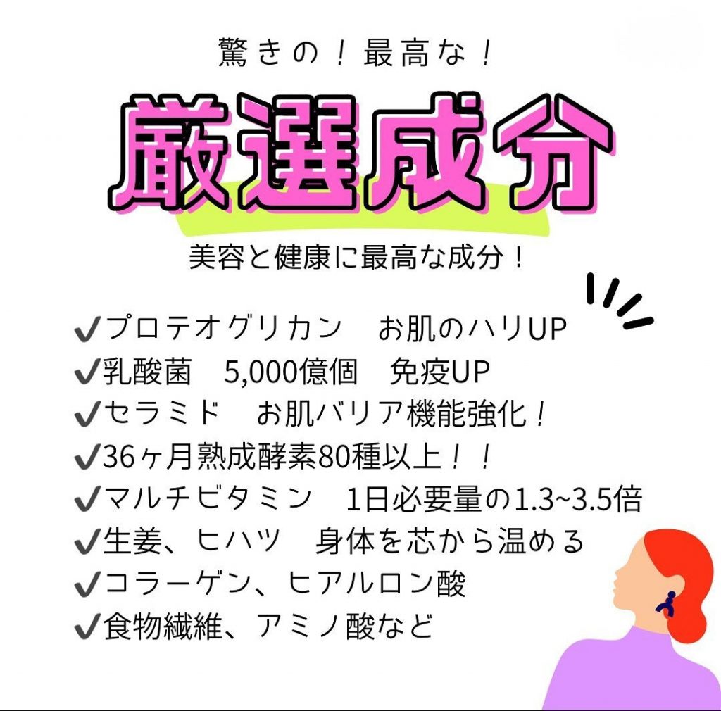 :•米セラミド6,000ug •超熟成酵素8 0種以上 •ビタタンンネラル •生姜・ヒ\ツ・ポリフェノール •BCCC•ヒアルロン酸 ・食物繊維•低分分子ラーゲン健康な体や肌を作るにはまずは腸から整えて いきたいですね!